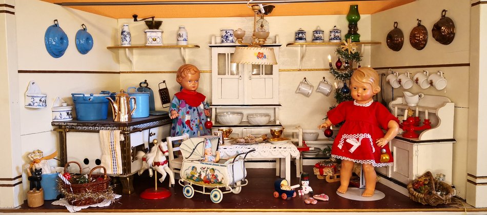 „Sammler sind glückliche Menschen.“ (J. W. Goethe) − Dies wird jeder bestätigen, dem Anett Andrich ihre umfangreiche Sammlung mit 50 Puppenküchen und 15 Kaufmannsläden zeigt. Hinzu kommen einige Puppenhäuser, zahlreiche Einrichtungsgegenstände für Puppenstuben sowie Püppchen und Kataloge aus unterschiedlichen Zeiten. Schwerpunkt ihrer Sammlung sind die Puppenküchen. Anett Andrich sammelt seit 25 Jahren. Ihr Mann schenkte ihr zum Geburtstag eine Puppenschlafstube und setzte damit die Initialzündung für die Sammelleidenschaft. Wenig später entdeckte Frau Andrich auf einem Trödelmarkt eine Puppenküche, der in den nächsten Jahren noch viele folgen sollten. Manches Sammlerstück musste erst wieder hergerichtet werden, weil der Zahn der Zeit seine Spuren hinterlassen hatte. Anett Andrich studierte Abbildungen in alten Verkaufskatalogen und Veröffentlichungen von Museen, kaufte entsprechende Tapeten, arbeitete mit Leim und Farbe und brachte so einige ihrer Puppenküchen wieder zu neuem Glanz. Zu jedem Objekt weiß Frau Andrich Geschichten zu erzählen. Sie kennt die Herkunft und macht voller Stolz und Freude auf die vielen liebevollen Details aufmerksam. Es fehlt einfach nichts, was damals in den großen Küchen zur Ausstattung gehörte. Die älteste Puppenküche stammt aus dem Jahr 1927, die jüngste aus Anfang der 1970er Jahre. Als Spiegelbild der Wirklichkeit geben sie Einblicke in Mode und Lebensweise früherer Zeiten. Die Sonderausstellung „In der Küche riecht es lecker…“ präsentiert einen Querschnitt der Sammlung von Anett Andrich.