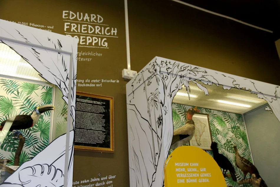 Das Naturkundemuseum Leipzig gehört aufgrund seiner einzigartigen Sammlung zu den bedeutenden Naturkundemuseen Deutschlands. Große Momente der Wissenschaftshistorie legen Zeugnisse in Ausstellung und Magazin des Museums ab. Darunter sind Exponate der ersten deutschen Tiefseeexpedition „Valdivia“, die ihren Ausgangspunkt in Leipzig hatte und einen Meilenstein der Tiefseeforschung darstellte. Ebenso in den Beständen vertreten ist die einzigartige Sammlung von Tierpräparaten, die Eduard Friedrich Poeppig als einer der bedeutendsten Forschungsreisenden des 19. Jahrhunderts während seiner Expeditionen durch Nord- und Südamerika gesammelt hat. Darüber hinaus zeigt das Naturkundemuseum Leipzig Sternstunden der Präparationskunst, da es über die größte zusammenhängende Sammlung von Dermopräparaten des weltbekannten Dermoplastikers Herman Heinrich ter Meer verfügt. Daneben belegen zahlreiche weitere Kostbarkeiten aus den Bereichen Geologie, Paläontologie, Botanik, Zoologie und Archäologie die Bedeutung des Museums, das 1906 gegründet wurde. Nun, mehr als 100 Jahre später, soll das Naturkundemuseum Leipzig mehr Raum und ein zeitgemäßes Gewand erhalten, um seiner Rolle als Vorreiter dieses Museumstypus über die Region hinaus gerecht zu werden: Auf dem Areal des Wilhelm-Leuschner-Platzes wird in den nächsten Jahren der ehemalige Bowlingtreff modernisiert und zum neuen Naturkundemuseum umgebaut. Am jetzigen Standort begleitet eine Interimsausstellung mit prägnanten Interventionen diesen Prozess und lädt die Besucherinnen und Besucher zur Teilhabe ein.