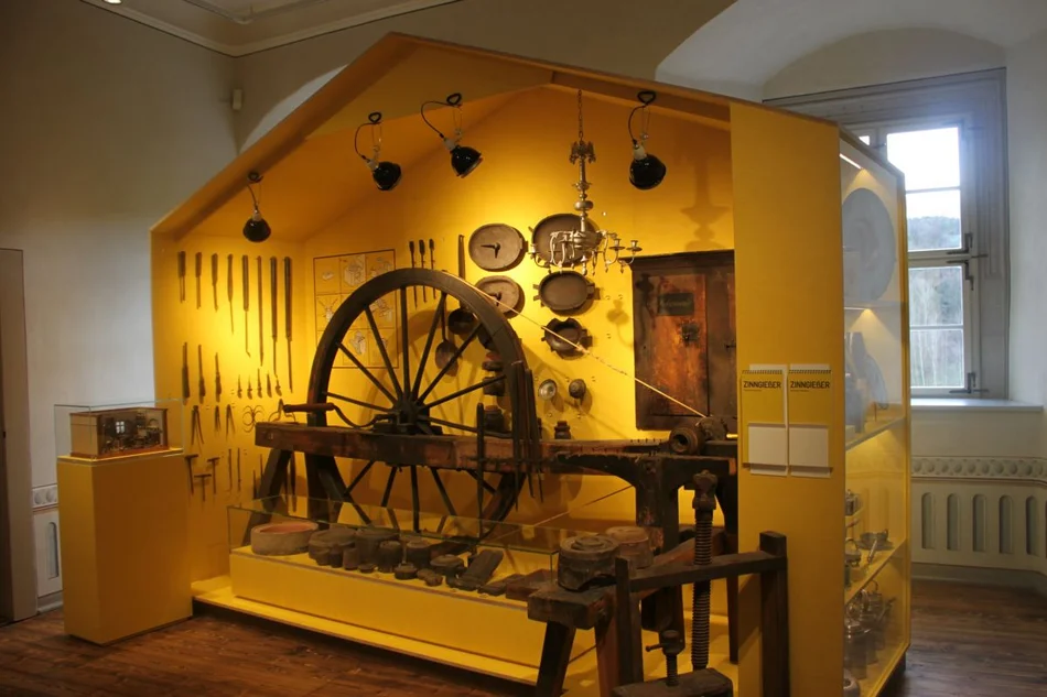 Weitere Ausstellungsschwerpunkte sind der Bergbau und das Eisen verarbeitende (Kunst)Handwerk. Eine erlesene Zinnsammlung und die faszinierende Kollektion zu erzgebirgischer Klöppelspitze mit Musterbüchern, Spitzen und Damenkleidern runden die Schau ab.