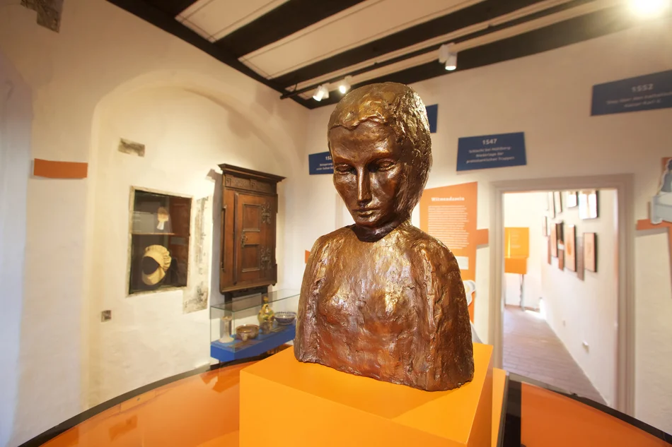 Die Ausstellung in der Katharina-Luther-Stube widmet sich der Biographie dieser außergewöhnlichen Frau, die eng mit dem reformatorischen Wirken ihres Mannes Martin Luther verbunden war und ihre letzte Ruhestätte in Torgau fand. Erstdrucke seltener zeitgenössischer Schriften und Zeugnisse der damaligen Alltagskultur, aber auch eine moderne Bronzebüste verdeutlichen ihr Lebensumfeld.