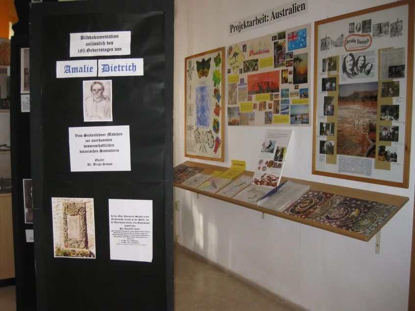 Als sie 1875 ihre Heimatstadt besucht, macht sie eine Anzahl von Dubletten ihrer Sammlung der alten Schule zum Geschenk, in der sie als Kind ihre vierjährige Schulbildung genossen hatte. Die Rede ist von der Botanikerin und Naturforscherin Amalie Dietrich (1821 - 1891), die aus ärmsten Verhältnissen kam und dennoch - unter ihrem Leitsatz 'Lieber ein schweres Leben als ein leeres Leben' - mit unermüdlichem Fleiß, stetem Wissensdurst und bewundernswertem Mut zu einer Berühmtheit wurde.