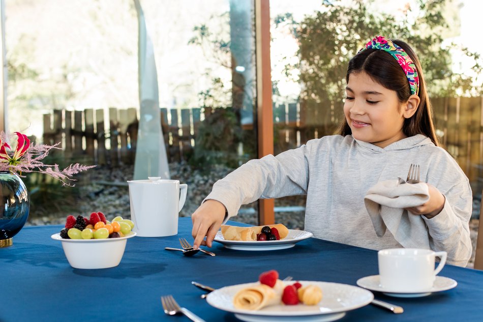 • Ein Mädchen an einem mit weißem Porzellan gedeckten Tisch hebt mit Besteck Obstsalat auf ihren Teller.